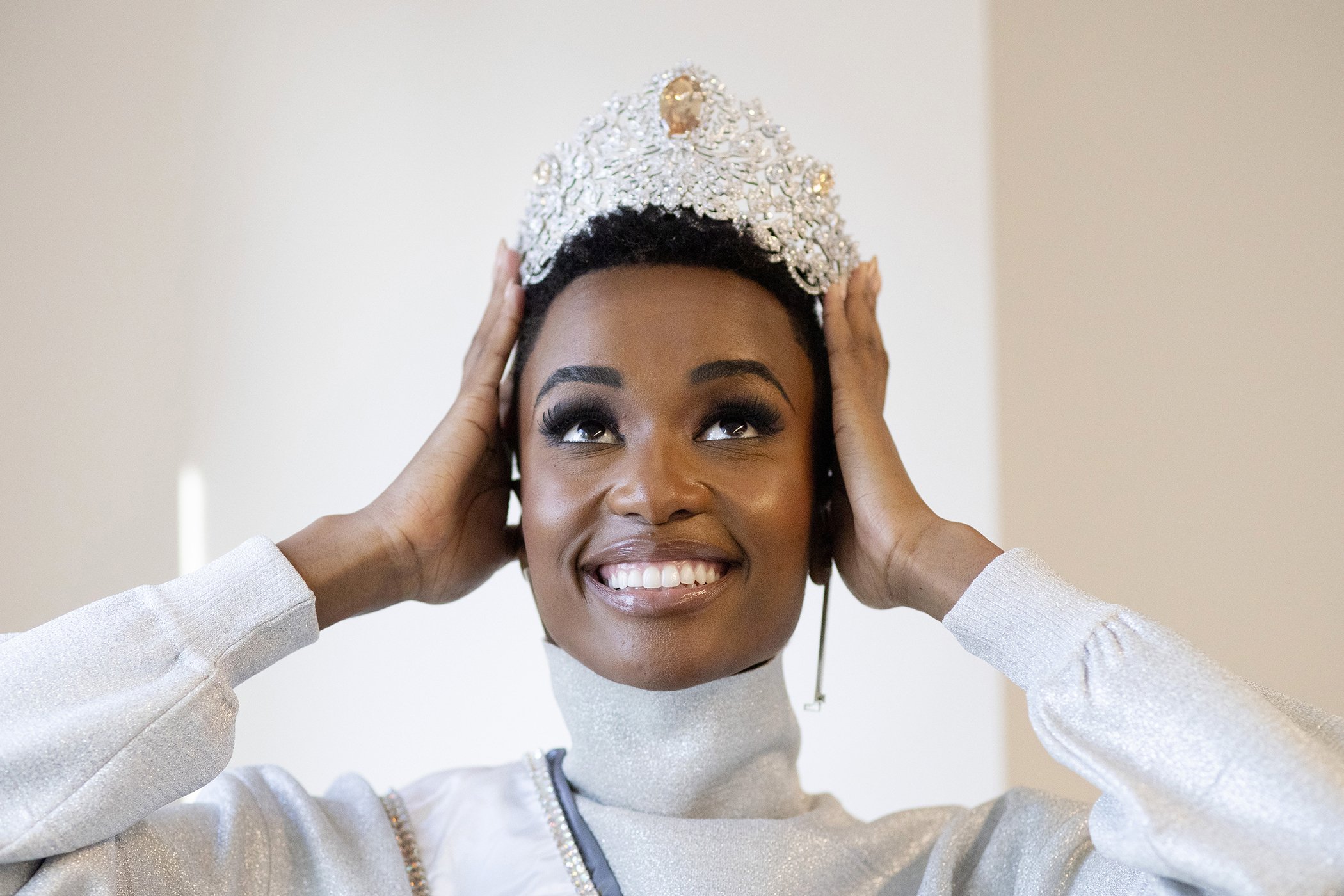 Miss Universe 2019 Zozibini Tunzi, of South Africa, poses for photos with her crown after an interview in New York on Dec. 11, 2019.